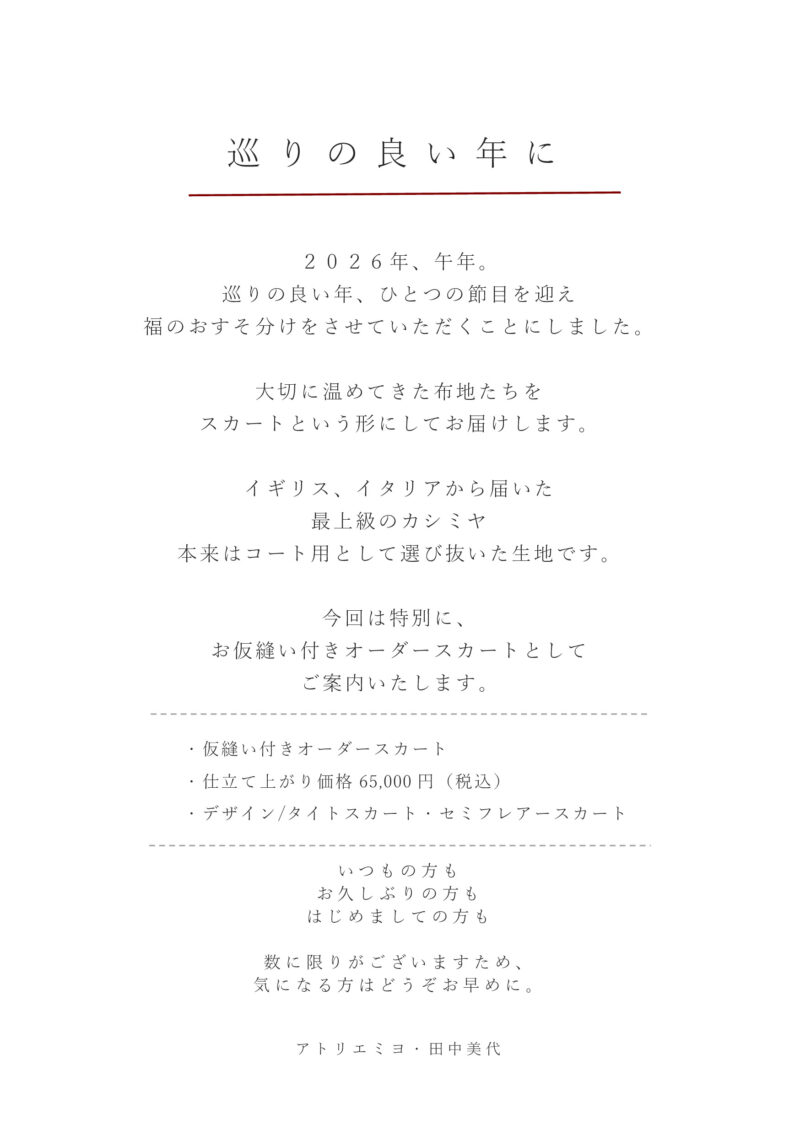 2026年、午年。 大切に温めてきた布地たちを スカートという形にしてお届けします。